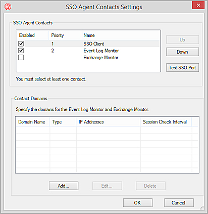 After you install the SSO Agent, you must add the domain information of the domains where the Event Log Monitors and Exchange Monitors are installed to the SSO Agent configuration in the Contact Domains list. If you have only one domain and the SSO Agent is installed on the domain controller, or if you have more than one domain and the Event Log Monitor and Exchange Monitor are on the same domain as the SSO Agent, you do not have to specify the domain information for the domain controller in the SSO Agent configuration Contact Domains list. If you have more than one Event Log Monitor or Exchange Monitor in the Contact Domains list, the SSO Agent queries the first entry in the list for the user credentials and group information. If the first Event Log Monitor or Exchange Monitor is not available, the SSO Agent contacts the next monitor in the list. This process continues until the SSO Agent finds an available monitor.