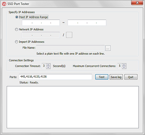 To verify that the SSO Agent can contact the Event Log Monitor and the Exchange Monitor, you can use the SSO Port Tester tool. With the SSO Port Tester tool, you can verify whether the SSO Agent can contact a server at a single IP address, or servers at multiple IP addresses or a range of IP addresses. To verify the connection for a single IP address or multiple IP addresses, rather than a range of addresses, you import a plain text file that includes the IP addresses to test. You can also specify the ports to test and the connection timeout interval.