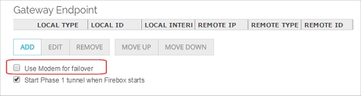 Because the device with modem failover enabled uses an ID for tunnel authentication, this device must initiate the VPN connection. This means that you cannot enable modem failover for both devices configured as gateway endpoints for the same branch office VPN tunnel.