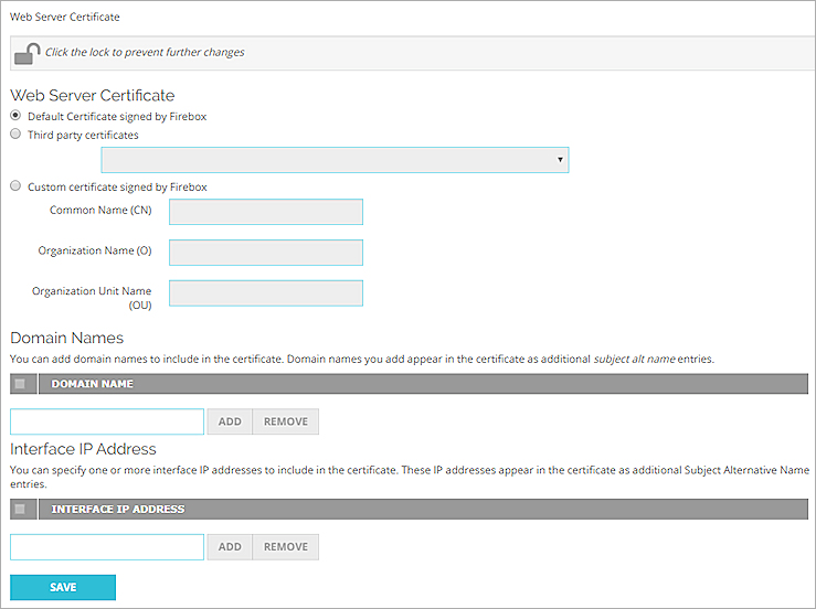 When users connect to your Firebox with a web browser, they often see a security warning. This warning occurs because the default certificate is not trusted, or because the certificate does not match the IP address or domain name used for authentication. You can use a third-party or self-signed certificate that matches the IP address or domain name for user authentication. You must import that certificate on each client browser or device to prevent the security warnings.