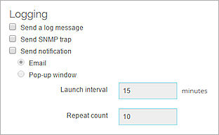 Repeat Count — This setting tracks how frequently an event occurs. When the number of events reaches the selected value, a special repeat notification starts. This notification creates a repeat log entry about that specified notification. Notification starts again after the number of events you specify in this field occurs.