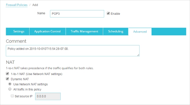 Because policy-based 1-to-1 NAT is enabled by default, you do not have to do anything to enable it. If you have previously disabled policy-based 1-to-1 NAT, to enable it again, select the 1-to-1 NAT check box in the policy configuration.