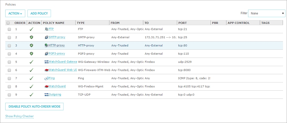 You can use Policy Checker to determine how your Firebox manages traffic for a particular protocol between a source and destination you specify. This can be a useful troubleshooting tool if your Firebox allows or denies traffic unexpectedly, or if you want to make sure your policies manage traffic the way you expect. Based on the parameters you specify, Policy Checker sends a test packet through your Firebox to see how the device manages the packet. If there is a policy that manages the traffic, Policy Checker highlights that policy in the Firewall Policies list.