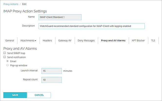 - In the IMAP proxy action configuration, select Proxy and AV Alarms.