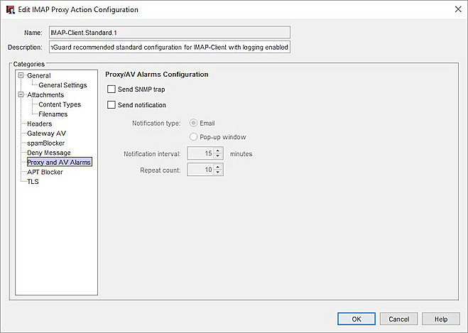 You can configure how the IMAP proxy sends messages for alarm and antivirus events that occur through the IMAP proxy. You can define the proxy to send an SNMP trap, a notification to a network administrator, or both. The notification can either be an email message to a network administrator or a pop-up window on the management computer.