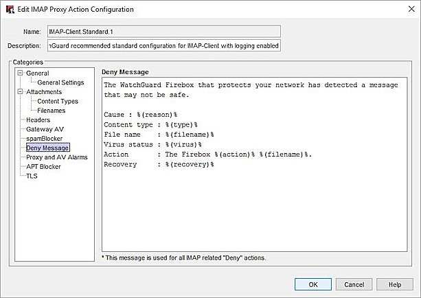 When content is denied, the Firebox sends a default deny message that replaces the denied content. This message appears in a recipient's email message when the proxy blocks an email. You can change the text of that deny message. The first line of the deny message is a section of the message header. You must include an empty line between the first line and the body of the message.