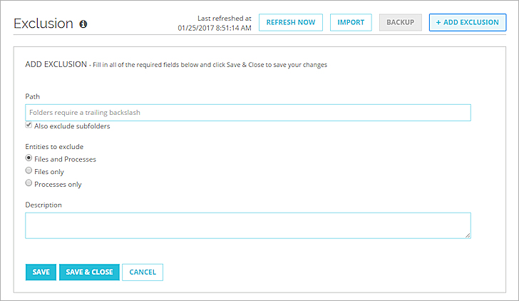You can save a backup of all exclusions to an .XML file. To add the exclusions to any TDR account, you can import the saved .XML file. This enables a TDR Service Provider to easily copy exclusions configured in one managed customer account to another managed account. To avoid duplicate exclusions, the imported exclusions are merged with the existing list of exclusions.