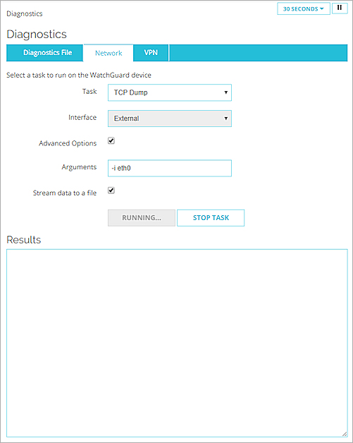 When you enable the Advanced Options to include arguments in the TCP dump task, you must always specify an interface. This can be a physical interface on the Firebox (such as, eth0), a Link Aggregation interface (such as, bond0), a wireless interface (such as, ath0), or a VLAN interface (such as, vlan10). If you specify a VLAN or bridge interface, and the traffic matches a proxy rule, TCP dump only captures the first incoming packet on that interface. To capture all packets, you must run the TCP dump task on the physical interface from where the packets originate.