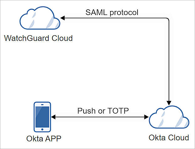 Okta communicates with various cloud-based services and service providers with the SAML protocol. This diagram shows the data flow of an MFA transaction for WatchGuard Cloud.