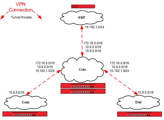 For example, the tunnel routes Colo-to-RMT and RMT-to-Colo use the subnet IP address 172.16.0.0/16 as the address of the Colo network. This enables these tunnels to handle all traffic between the small office (RMT) network and the Colo trusted (172.16.1.0) and optional (172.16.2.0) networks.