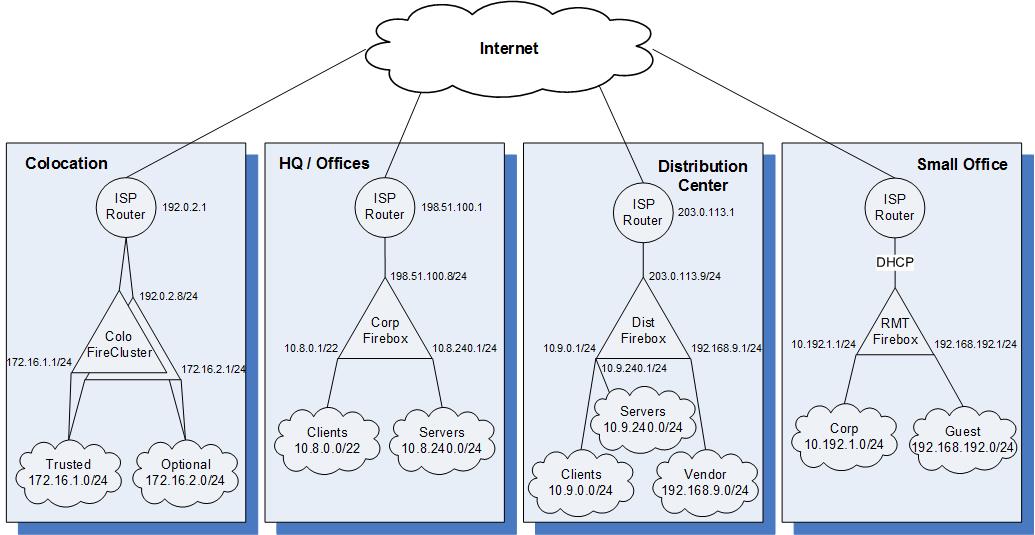 When you look at the tunnel routes, remember that the local-remote pairs are defined relative to the two endpoint networks for the tunnel traffic. In some cases, the local address in a VPN tunnel route is the address of a network at another connected site. For example, in the Colo configuration, the Corp-to-RMT tunnel route uses the network IP address of the trusted network at Corp as local, even though it is not physically located at the Colo site.