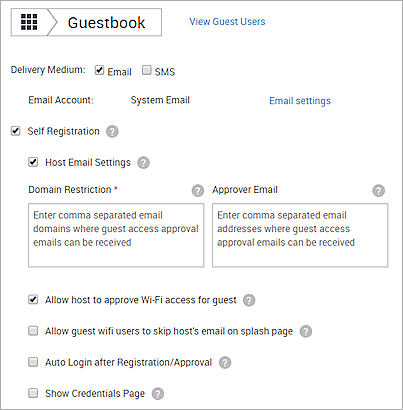 - Allow guest wifi users to skip host's email on splash page — If this option is selected, guests do not need to provide the host email address on the splash page. The approval email will be sent to the email addresses configured in the Approver Email field. If this option is selected, at least one email address must be added to the Approver list.