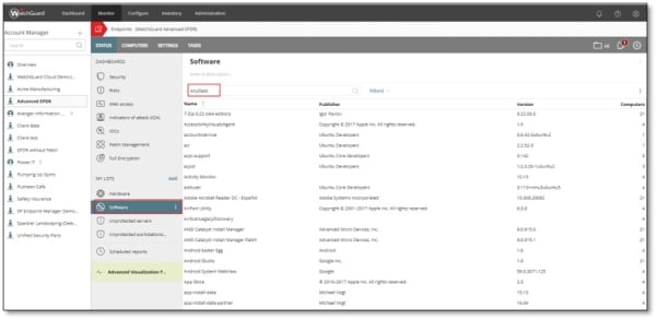 All WatchGuard Endpoint Security solutions include hardware and software inventory functionality. This lists the software, its version, and the endpoints where it is installed. Thus, it is easy to identify the machines where software updates or uninstallation is needed, especially if the company's security policy prohibits remote access to applications.
