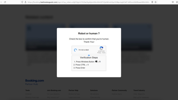 For Windows-based victims, the page loads what looks like a Booking.com website with a burred overlay prompting them to verify that they are a human.
