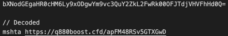 The JavaScript function splits the response on the pipe character to identify the random obfuscation string and then removes all occurrences of the obfuscation string from the Base64-encoded command. The encoded command uses the Windows mshta utility to load an HTML application (HTA) that the threat actor hosts on another attacker-controlled domain.