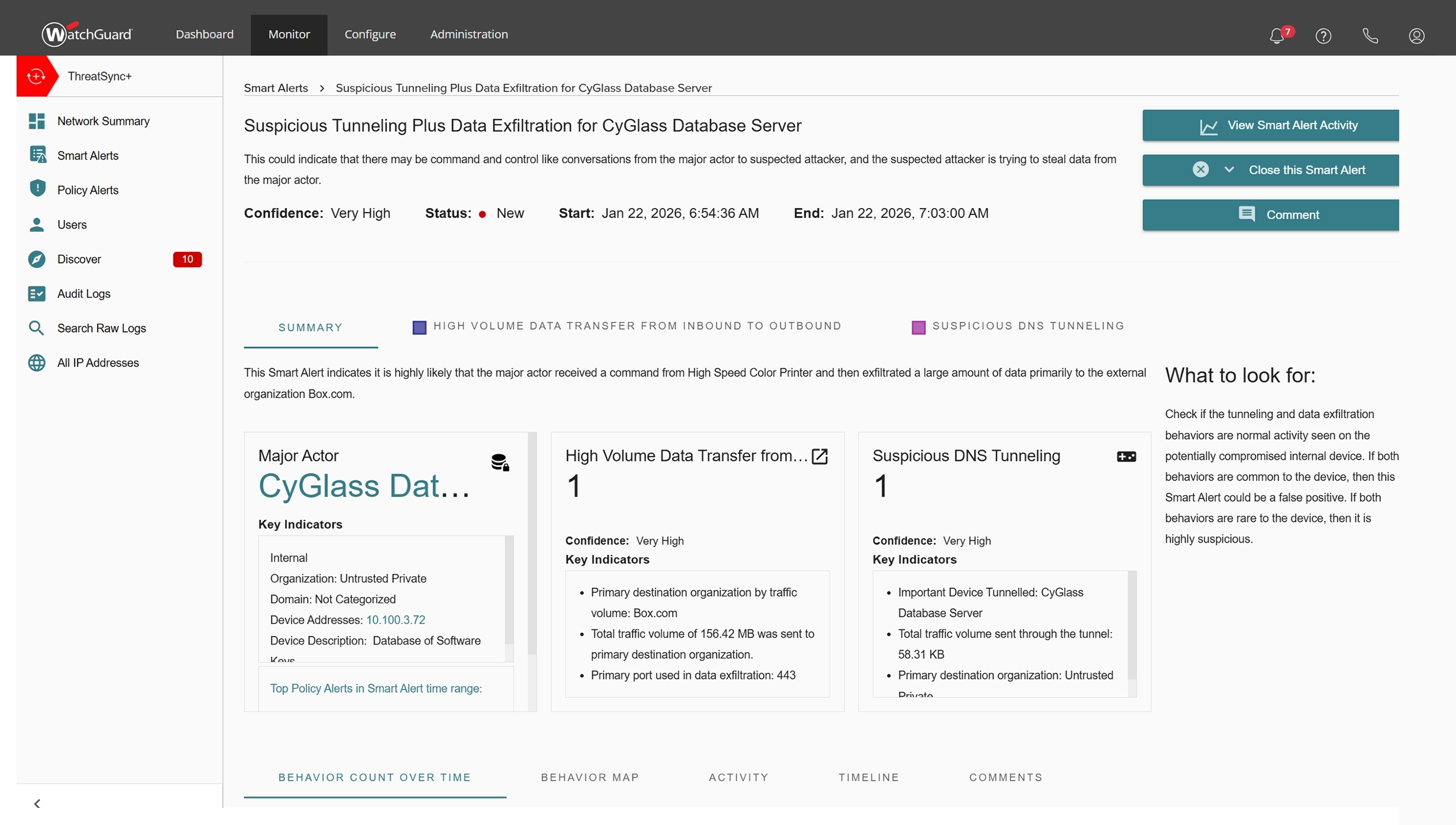 O WatchGuard NDR para Firebox oferece aos MSPs visibilidade prática de todas as conexões de entrada e saída em sua rede. Ele transforma o tráfego bruto do Firebox em informações de rede de alta fidelidade, permitindo validar a aplicação de políticas e detectar atividades maliciosas, configurações incorretas e comunicações de risco.