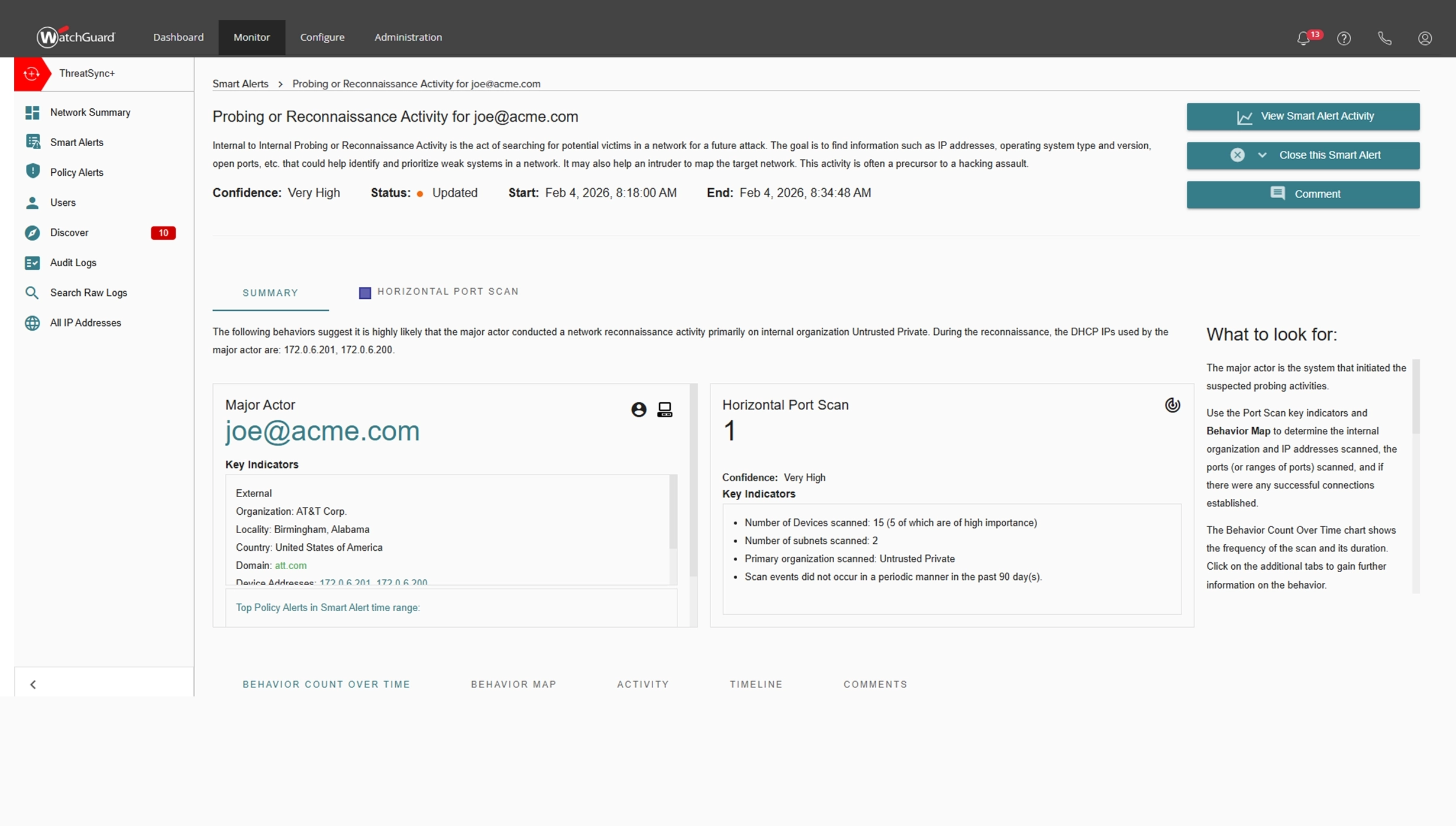 O WatchGuard NDR utiliza redes neurais multicamadas e aprendizado de máquina baseado em fluxo para analisar dados NetFlow e detectar ameaças que burlam as defesas de perímetro. Ele identifica tráfego de comando e controle, movimentação lateral, sinalização (beaconing), varredura, padrões de acesso anormais e transferência de dados suspeita, revelando ataques ocultos no tráfego de rede.