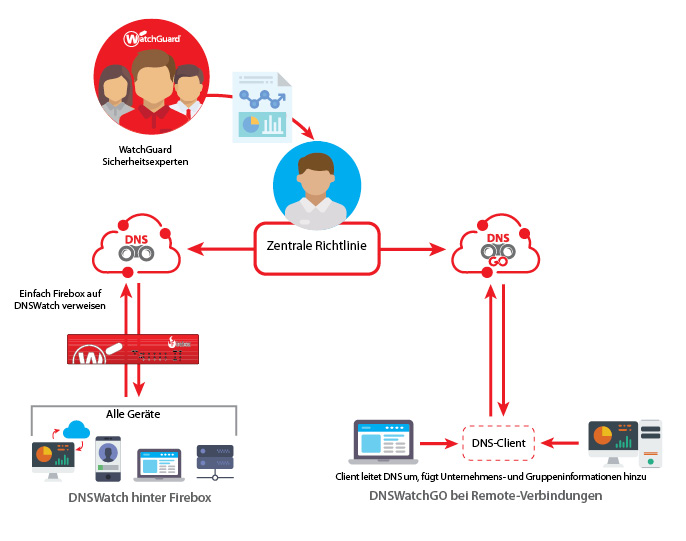 Ob in einem Heimbüro, einem Café oder Konferenzzimmer im Hotel gearbeitet wird, der moderne Mitarbeiter genießt die Möglichkeit, dort produktiv zu sein, wo er sich am wohlsten fühlt. Heute arbeiten drei Viertel aller Mitarbeiter weltweit mindestens einen Tag pro Woche nicht im Büro. Daher werden immer mehr Tätigkeiten außerhalb des Netzwerks und der traditionellen Sicherheitstools ausgeführt. WatchGuard DNSWatchGO bietet Schutz auf DNS-Ebene und Content-Filter, die Ihr Unternehmen auch ohne VPN vor Phishing, Ransomware und anderen Angriffen schützt, selbst wenn sich Ihr Nutzer außerhalb des Netzwerks befindet.