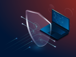 Illustration showing a Cloud above a shielded laptop in front of 3 shielded servers