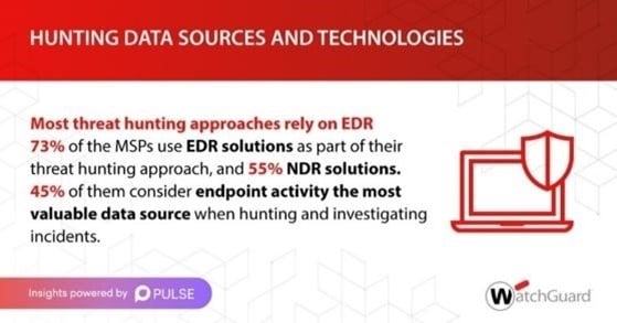 El 73% de los MSP utilizan soluciones EDR como parte de su enfoque de threat-hunting y el 55% soluciones NDR. El 45% considera que la actividad de los endpoints es la fuente de datos más valiosa a la hora de cazar e investigar incidentes.