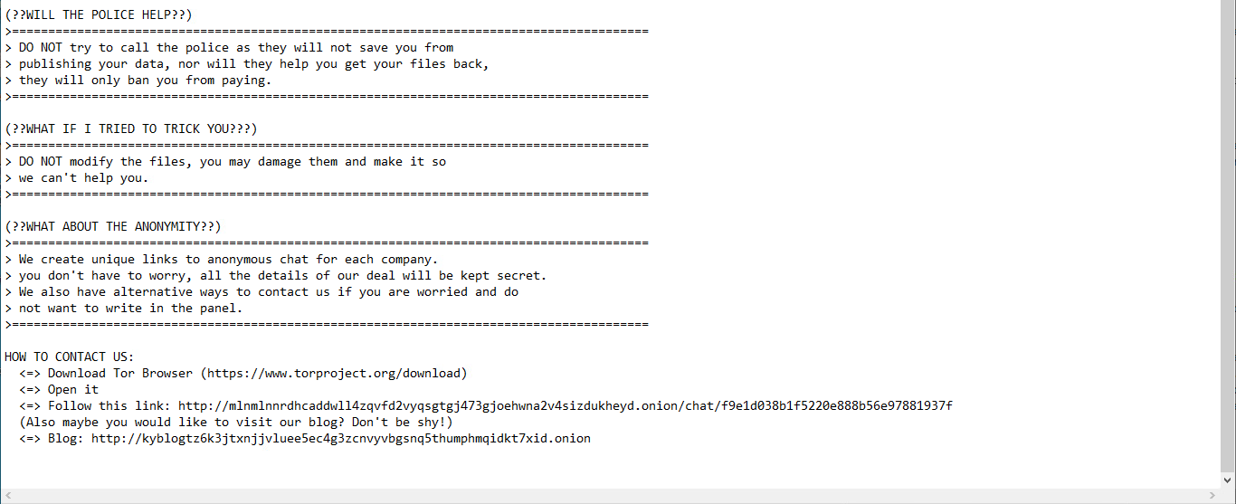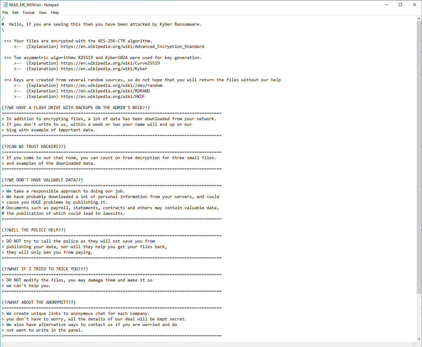Uses AES-256-CTR to encrypt files with Curve25519 + Kyber-1024 quantum encryption to create encryption keys. Likely named after the encryption mechanism Kyber-1024, which is seldom seen or used for ransomware at the time of it's inception.
