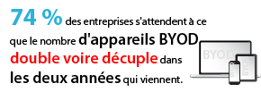 - BYOD : l'adoption continue de stratégies régissant les équipements personnels (BYOD, Bring Your Own Device) ajoute encore des difficultés du fait de la multitude d'appareils mobiles inconnus qui s'introduisent dans vos réseaux sans fil. Les ordinateurs portables et autres appareils mobiles personnels ne présentent que rarement le niveau de protection requis pour un usage en entreprise. Pourtant, lorsqu'un employé connecte son propre appareil à votre réseau, c'est toute l'entreprise qui prend un risque.