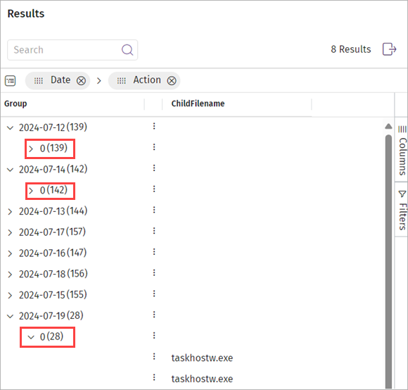 Im Abschnitt Ergebnisse können Sie Gruppen von Elementen auf Basis der Werte in einer ausgewählten Spalte erstellen, um die Details zu analysieren.