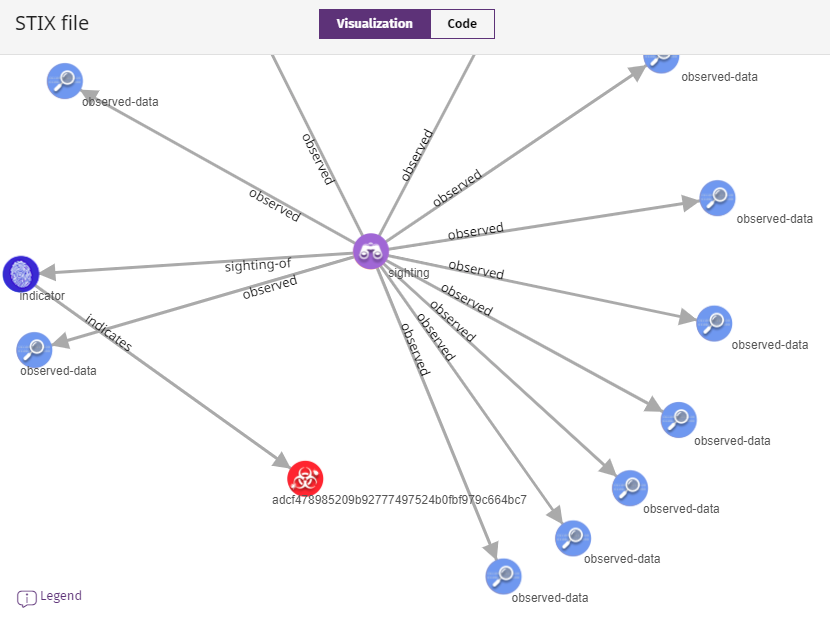 - Ursprüngliche STIX-Datei anzeigen — Öffnet die ursprüngliche STIX-Datei für einen IOC. Die Seite STIX-Datei zeigt eine grafische Darstellung sowie den Code des IOC. Weitere Informationen finden Sie unter Ursprüngliche STIX-Datei anzeigen.