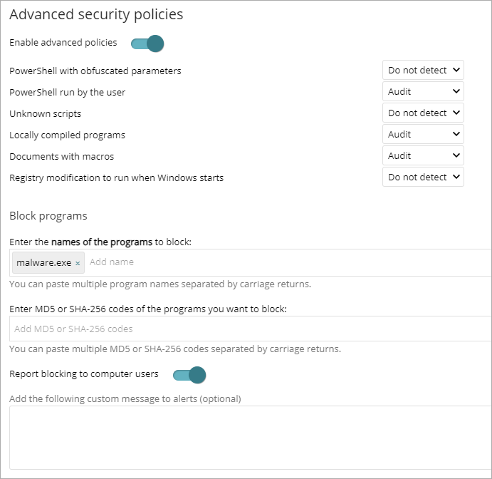 - Geben Sie im Abschnitt Programme blockieren die Dateinamen, MD5-Codes oder SHA-256-Codes der Programme ein, die Sie blockieren möchten. Sie können eine Liste von Dateinamen oder Codes einfügen, die durch Zeilenumbrüche getrennt sind.