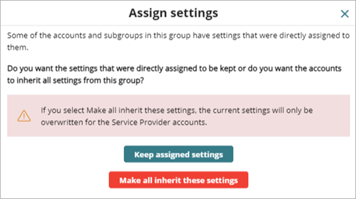 Wenn einem Service-Provider-Konto oder -Kontogruppe mit bestehenden Einstellungen Einstellungen zugewiesen werden, kann das Tier-1-Service-Provider-Konto das verwaltete Konto entweder zwingen, alle Einstellungen zu übernehmen, oder zulassen, dass das Konto die bestehenden Einstellungen beibehält.