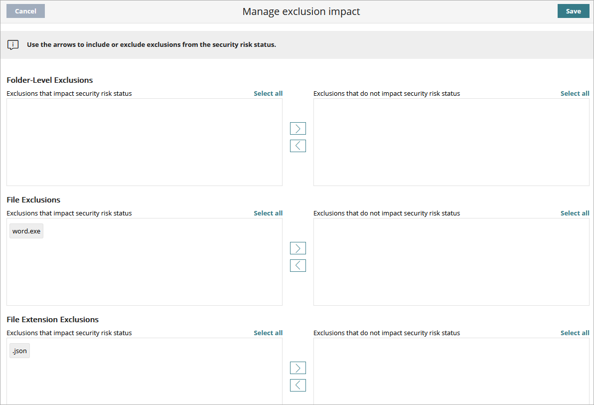 - Verwenden Sie die Pfeile auf der Seite, um Ordner, Dateien und Dateierweiterungen anzugeben, die Auswirkungen auf den Sicherheitsrisikostatus haben bzw. nicht haben.