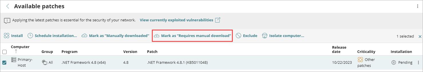 Nachdem Sie einen Patch als manuell heruntergeladen markiert haben, ändert sich dessen Status von Erfordert manuellen Download zu Ausstehend (manuell heruntergeladen) für alle Computer, die ihn installieren müssen, und der Patch kann wie ein automatisch heruntergeladener Patch installiert werden. Weitere Informationen finden Sie unter Patches Installieren.