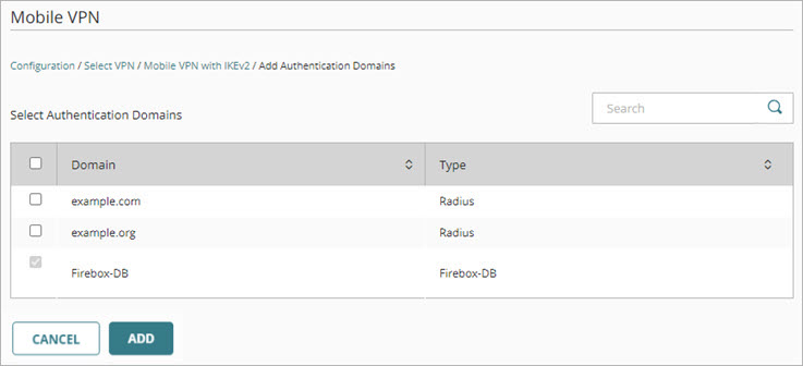 - Wählen Sie die Authentifizierungsdomänen aus, die Sie für die Authentifizierung von Mobile VPN with IKEv2-Benutzern verwenden möchten.