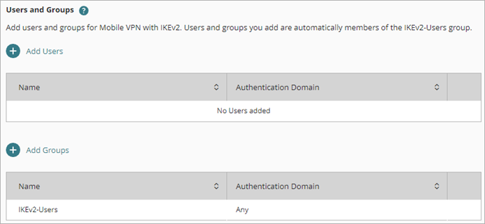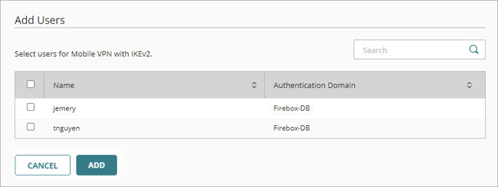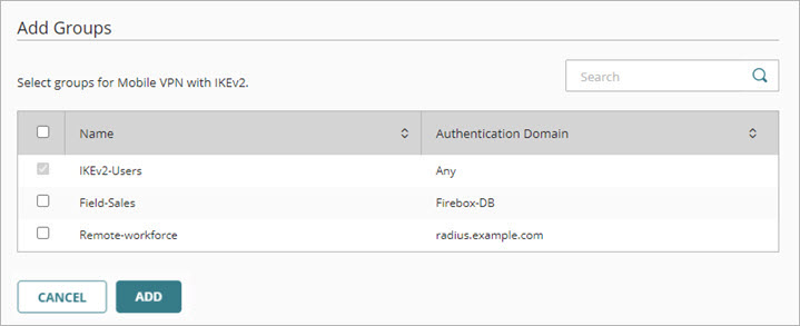 Nachdem Sie die Authentifizierungsdomänen festgelegt haben, wählen Sie Benutzer und Gruppen aus, die einen IKEv2-VPN-Client verwenden können, um eine Verbindung zu den von der Firebox geschützten Netzwerkressourcen herzustellen.