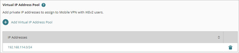 Der virtuelle IP-Adressenpool ist die Gruppe der privaten IP-Adressen, die die Firebox den Mobile VPN with IKEv2-Benutzern zuweist. Der Standardwert lautet 192.168.114.0/24. Sie können zum Pool weitere Adressen hinzufügen und die Standardadresse entfernen.