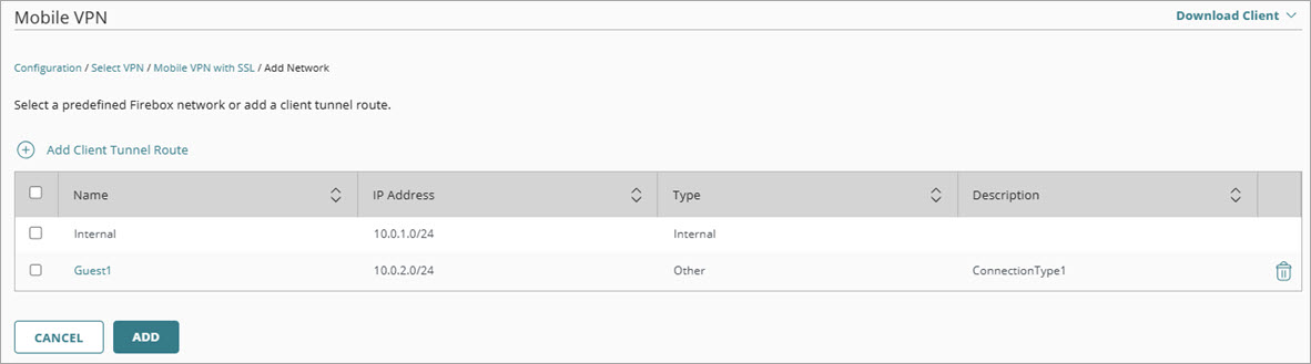 Die Client-Tunnelroute ist eine verfügbare Firebox-Ressource auf der Seite Netzwerk hinzufügen für Mobile VPN with SSL- und Mobile VPN with IKEv2-Konfigurationen.