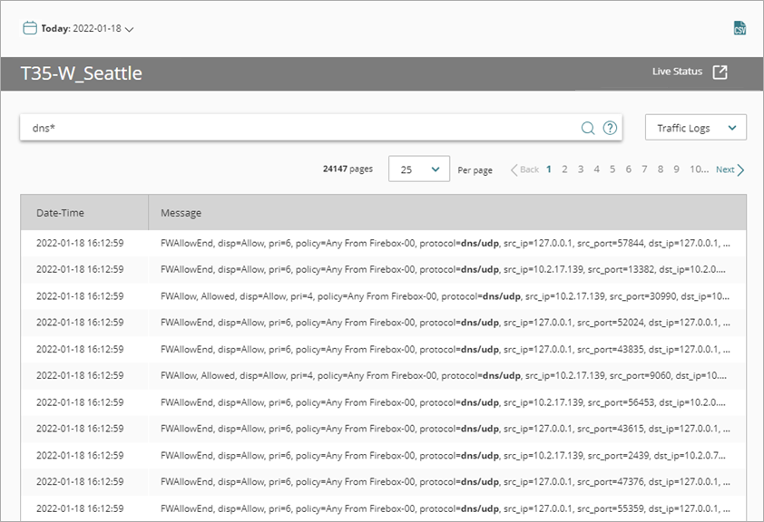 Ihre Abfrage kann jeden beliebigen Feldnamen enthalten, der in einer Firebox-Protokollmeldung erscheint. Weitere Informationen über einige der von Ihrer Firebox erzeugten Protokollmeldungen finden Sie im WatchGuard Log Catalog auf der Seite Produktdokumentation.