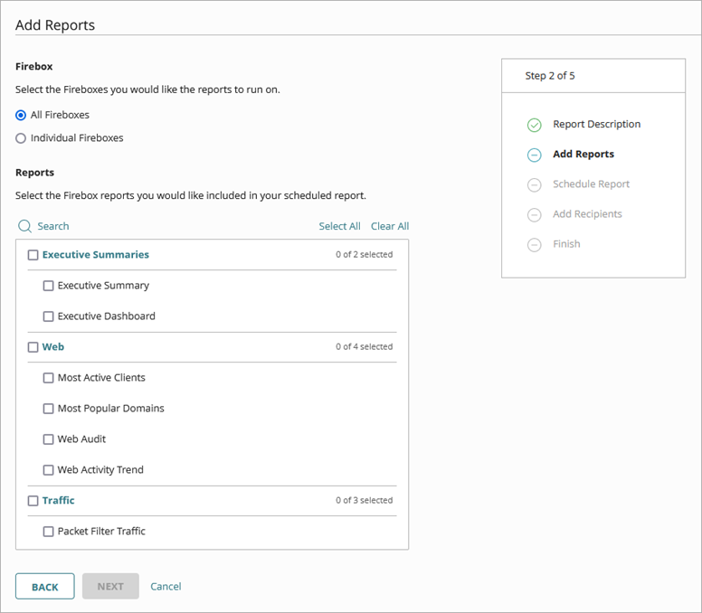 1. Für die Erstellung von Berichten für alle Geräte wählen Sie Alle Fireboxen.