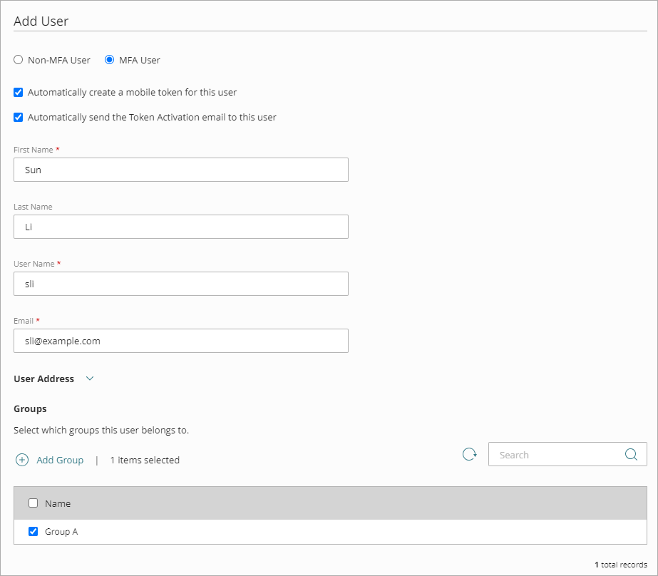 6. Wählen Sie aus der Liste Gruppen die WatchGuard Cloud Directory-Gruppe(n) aus, zu der/denen Ihr Benutzer hinzugefügt werden soll. Wenn Sie keine Gruppen haben, oder zusätzliche Gruppen hinzufügen möchten, klicken Sie auf Gruppe hinzufügen. Die Gruppe bestimmt, welche Authentifizierungsregeln für diesen Benutzer gelten. In unserem Beispiel fügen wir Sun Li zur Gruppe A hinzu, die wir zuvor erstellt haben.