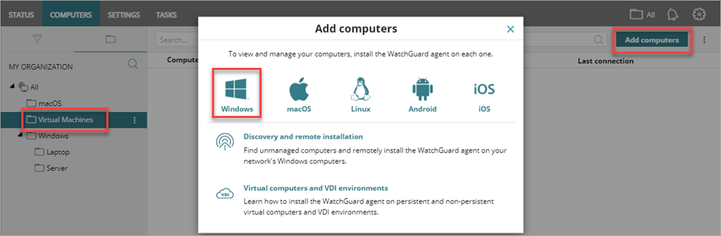 - Wählen Sie auf der Registerkarte Computer die Virtuelle Maschinen-Gruppe und klicken Sie auf Computer hinzufügen, um das Installationsprogramm herunterzuladen.
