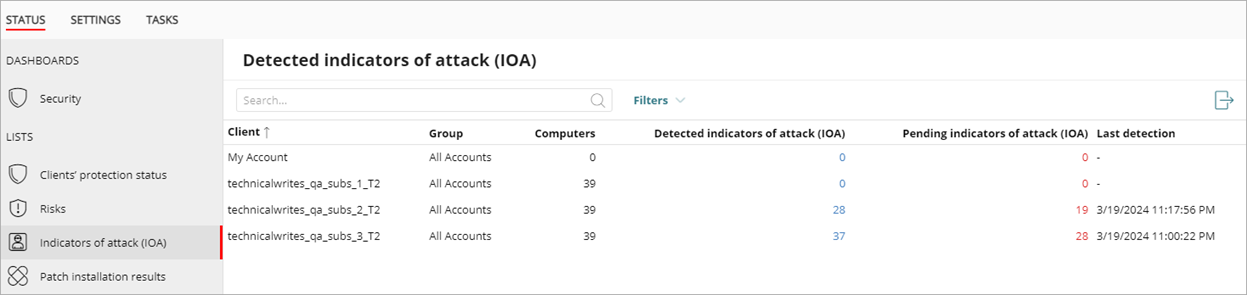 Als Service-Provider können Sie auf der Seite Status eine Liste der erkannten Angriffsindikatoren (IOA) für die einzelnen Client-Konten anzeigen, einschließlich der Anzahl der betroffenen Computer.