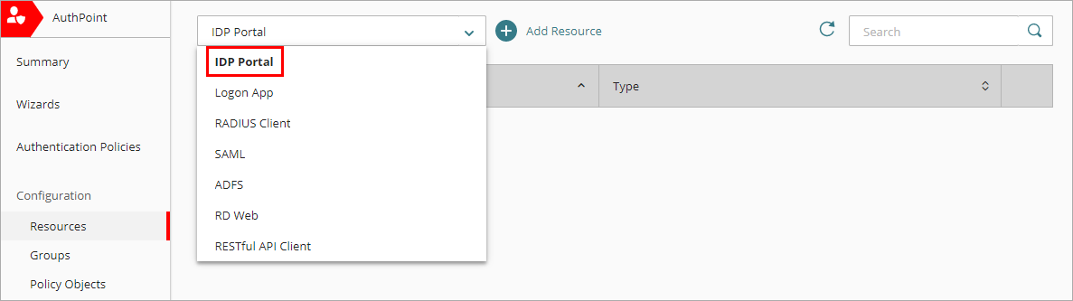 In unserem Beispiel fügen wir einen Identitätsanbieter (IdP)-Portal-Ressource hinzu. Das IdP-Portal ist eine Portalseite, die den Benutzern eine Liste der verfügbaren SAML-Ressourcen für ihre AuthPoint-Gruppe bereitstellt. Da das IdP-Portal eine AuthPoint-Ressource ist, können Sie es zum Testen von MFA verwenden, ohne dass eine Konfiguration durch Drittanbieter erforderlich ist.