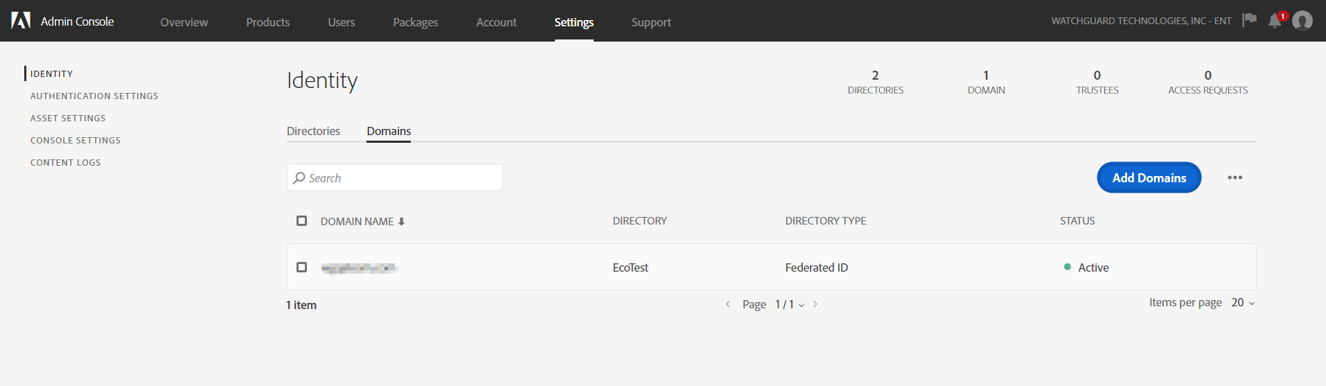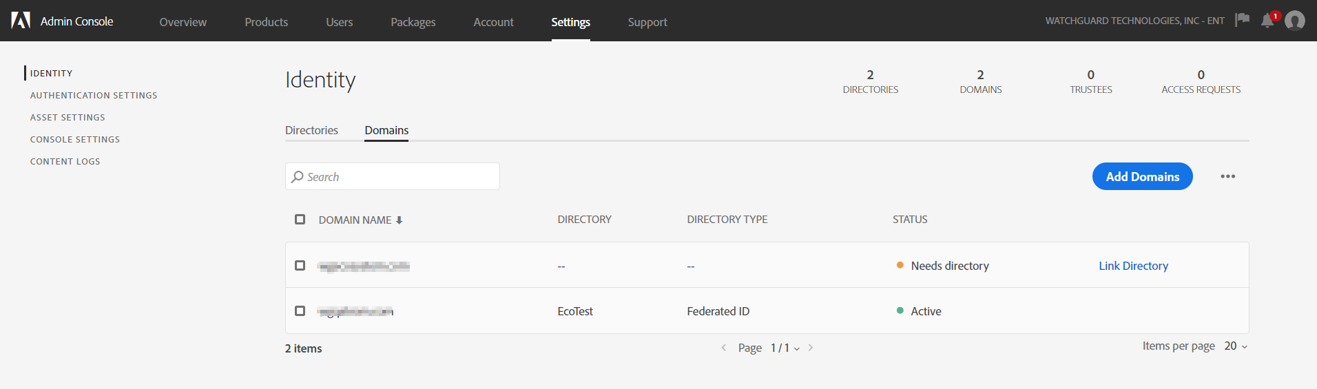 - When the validation is complete, you can link your domain to directories. Select Settings > Identity.