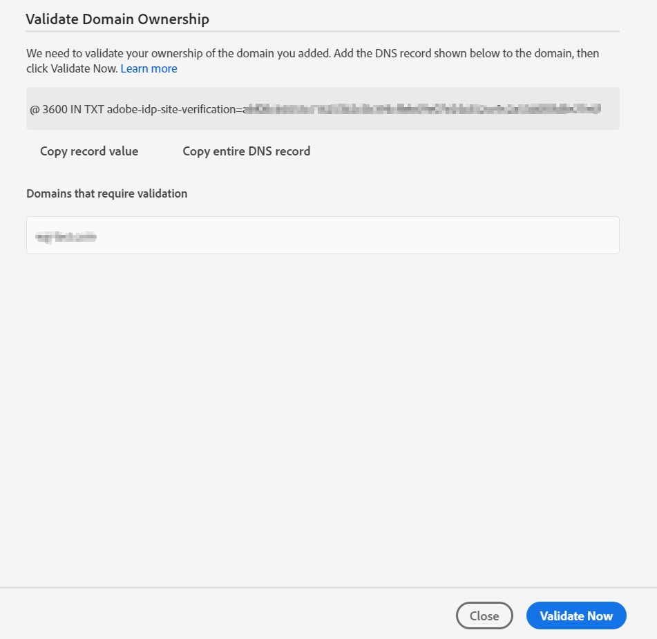 - You are given a DNS record value. Add this to your domain DNS record. Once it is added to your domain DNS record, click Validate Now.