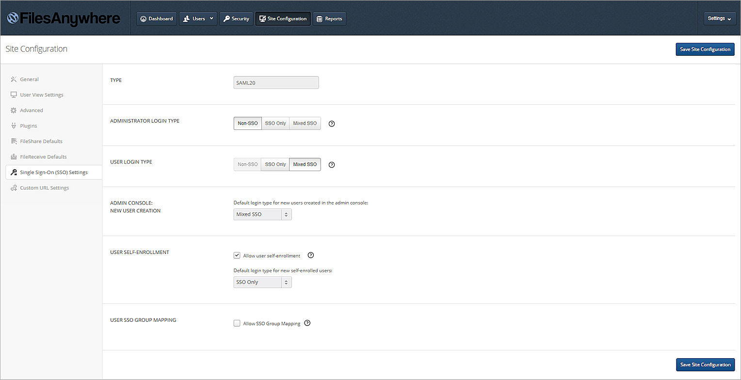 When your SSO configuration for FilesAnywhere is done, you can navigate to Site Configuration > Single Sign-On(SSO) Settings to set up different SSO policies for your users.