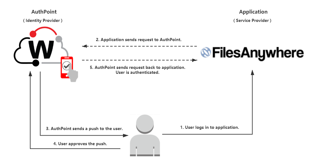 AuthPoint communicates with various cloud-based services and service providers with the SAML protocol. This diagram shows an MFA transaction for FilesAnywhere.