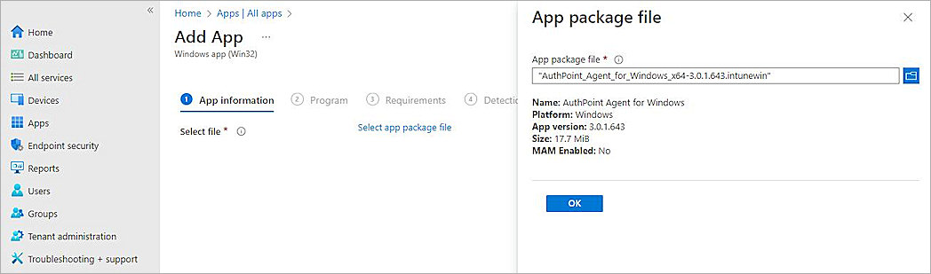 The App Package File page opens. - From the App Package File drop-down list, select the .intunewin file you created in Create an .intunewin File.