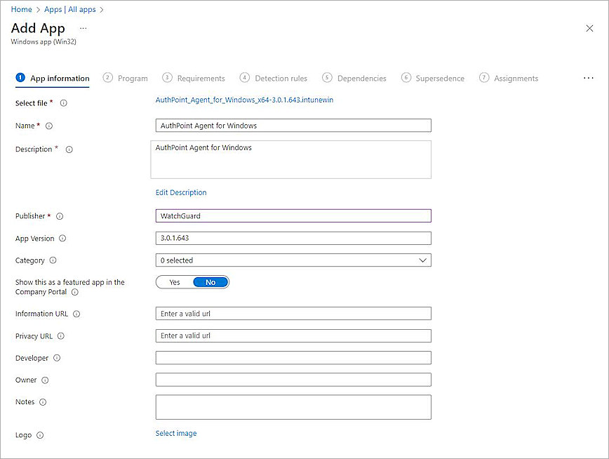 The Add App page opens with additional tabs. - On the App Information page, in the Publisher text box, type a name. In our example, we type AuthPoint Agent for Windows.