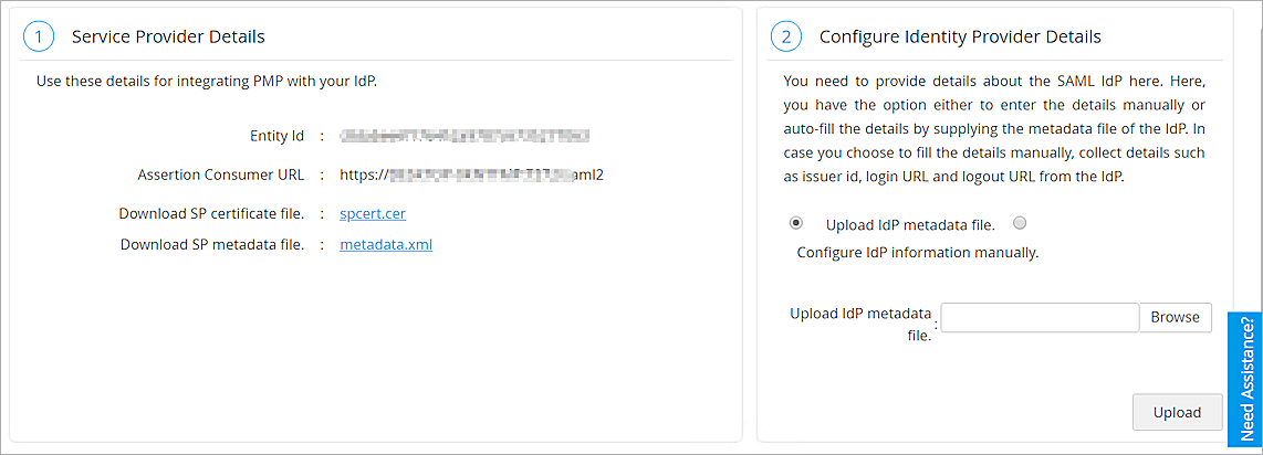 - In the Service Provider Entity ID text box, type or paste the Entity ID value from the SAML Single Sign On page in ManageEngine PMP.
