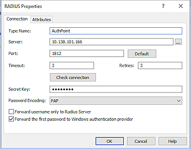 The RADIUS Properties dialog box appears. - Select the Connection tab.